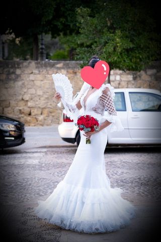 Precioso vestido de novia de color blanco, ideal para una boda elegante. Luce impecable, con una falda de volantes que le da un toque romántico y flamenco. - Diseño romántico con detalles delicados. - Falda con múltiples capas de volantes. - Escote corazón y espalda abierta.