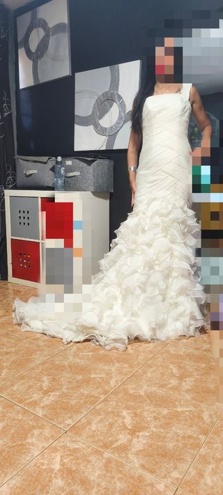 Precioso vestido de novia de color blanco, talla S. Es un diseño de cola de sirena con varias capas de volantes que le dan un toque romántico y elegante. - Diseño de sirena. - Varias capas de volantes en la falda. - Cierre de botones en la espalda. Para más información en el 601034068.