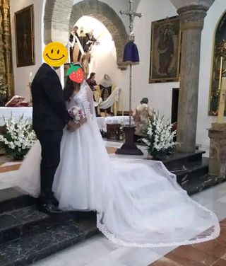 vestido de novia con cola desmontable y velo. el único defecto es la falta de un botón (en foto de la espalda) y un poco de roce imperceptible en el filo de la tela de detrás del vestido que toca el suelo (última foto), por delante está perfecto y la cola entera también. mido 1,60cm aprox más tacones de unos 7cm