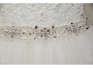 Elegante traje de novia con un diseño de corte imperio y falda voluminosa. - Cuerpo drapeado. - Cinturón adornado con pedrería. - Detalles de encaje en la falda. - Falda de tul multicapa.