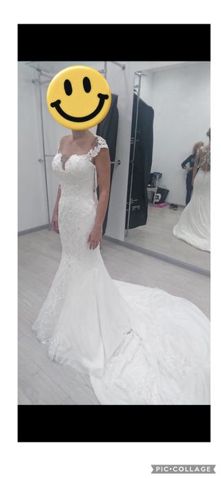 Elegante vestido de novia con un diseño sofisticado. sin estrenar su previo 3400€ - Cuerpo de encaje con tirantes finos. - Falda de corte sirena. - Cola larga con detalles de encaje. -vélo incluido.
