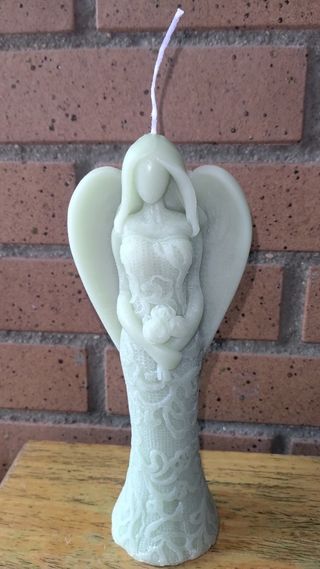 Espectacular vela que representa a una Angelita vestida de gala o de novia. Mide casi 19 cm de altura. Los detalles del vestido son preciosos.