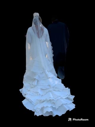 Se vende vestido de novia utilizado en septiembre. Tiene sobre cola que se puede quitar y dejar una cola más corta. Espalda al aire y media manga. Talla 36, tiene para sacar y hacerlo más grande. Fue lavado en casa al día siguiente, pero habría que llevarlo a lavandería (de ahí su precio), la sobre cola está perfecta y la cola un poco manchada por abajo. Lo demás está bien, mejor verlo porque no deja de ser un vestido ya usado. En las últimas foto puede verse la parte de abajo actualmente