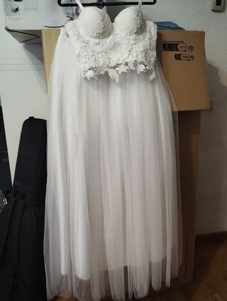 Precioso vestido de novia en color blanco, ideal para una boda civil o una celebración íntima. Está completamente nuevo, sin usar. - Diseño de dos piezas: top de encaje y falda de tul con cintura de goma. - El top tiene un estilo bustier con copas incorporadas, ajustable de ancho 77-82cm de diámetro debajo del pecho . - La falda es larga y vaporosa, de tul suave, con cintura de goma y 113 cm de largo. - Perfecto para una boda en la playa o en un jardín.