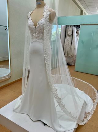 Precioso vestido de novia, sin estrenar, en crepe color ivory con encaje de algodón y seda en parte superior. Velo a juego en tul sedoso de alta calidad en color ivory con puntilla de encaje. - Escote en V con detalles de encaje. - Falda de corte sirena. - Incluye velo largo con encaje en el borde. - Cola de 3 metros de largo perfecta para una boda elegante.