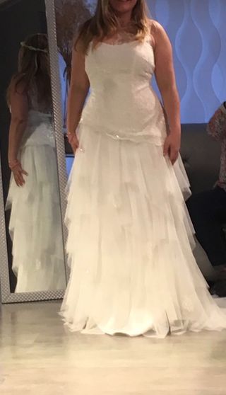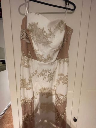 Se vende vestido de novia sin estrenar. Blanco, beig y toques dorados. El vestido es palabra de honor. Talla M, 38. Sin usar. Se compro para segundo vestido pero no se utilizo. También se puede utilizar para vestido de fiesta. Precio algo negociable