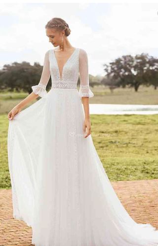 Vestido de novia "Alma Mónaco", segunda marca de Rosa Clará. Estilo bohemio, princesa, romántico. El color del vestido es blanco marfil, la parte de arriba es de guipur, con tirantes y con un ligero toque brillante. Cada tirante lleva un tul igual que la falda; el tul de cada tirante se puede quitar. Espalda descubierta con botones en la parte baja de la espalda, la falda es de tul con capas y forro. Aún lleva la etiqueta de la lavandería, está impecable. Talla 42-44, vestido muy cómodo de llevar y muy favorecedor. El vestido viene con la percha y la funda original de tienda. Zapatos de novia de regalo (usados sólo una vez).