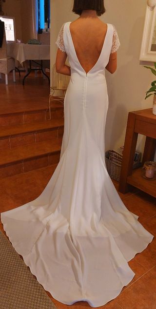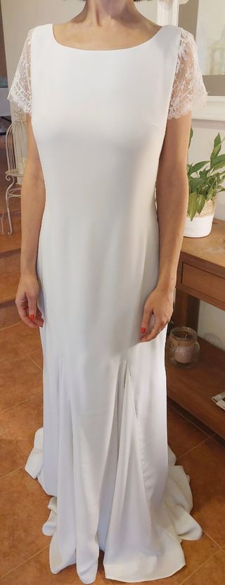 Vestido de novia nuevo. Sin usar. Precio original 2900 €. Comprado por 1300 € de outlet en Cymbelline. Crepe blanco con mangas de encaje. Con cola. Talla 42 modificable hasta 32-34.