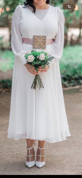 Elegante vestido de novia de color blanco. Cinturon aparte - Diseño sofisticado. - Cinturón con aplique ornamental.