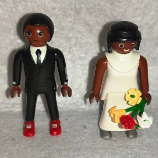 Set de figuras Playmobil de una pareja de novios. - Figura de novio con traje negro y corbata. - Mujer de raza negra con vestido de novia blanco y ramo de flores. - Incluye ramo de boda con flores rojas, amarillas y blancas.