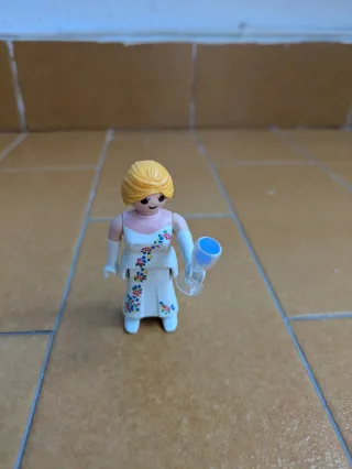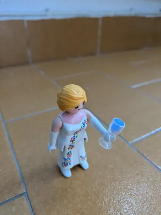 Figura de Playmobil de una chica vestida de novia. - Incluye una tarta. - Viene con una copa.