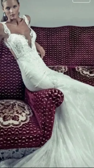 Vestido de novia de alta costura, con un diseño elegante y sofisticado. Está confeccionado a mano con perlas y cristales de Swarovski y encaje de Chantilly. En las fotos no puede apreciarse bien pero se le ve un precioso brillo sutil de los cristales de Swarovski. Es elástico, muy cómodo y se adapta muy bien a la figura. En la zona del pecho tiene unos cascos que te hacen sentir cómoda y segura. - Corte sirena que realza la figura. - Se vende con velo a juego con los mismos cristalitos de Swarovski. - Precio original 3.200€