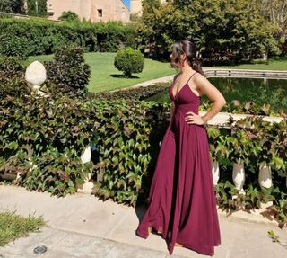 Mono "vestido" talla S. Usado una vez para un evento, como nuevo. Es muy cómodo al ser un mono de pierna ancha permitiendo cualquier movimiento; la tela es agradable y lleva una capa encima de gasa que le da una caída elegante y especial como si fuera a su vez un vestido. Comprado en la tienda de vestidos de novia e invitada Victoria Imaz, Pamplona. Precio original 140€. Tela de gasa y forro en pantalón. Escote con estructura y relleno y tirantes regulables. El color a la luz es como se aprecia en las primeras fotos, tonos vino y berenjena.