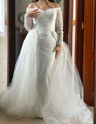 Elegante vestido de novia con detalles de encaje. - Diseño de hombros descubiertos. - Mangas largas de encaje. - Falda con sobre-falda de tul. Nuevo sin usar, no estrenado Precio negociable