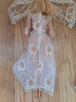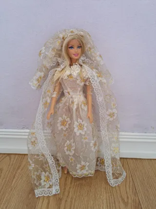Muñeca Barbie vestida de novia con un espectacular traje. - Vestido largo de encaje blanco con detalles florales dorados. - Velo y capa a juego con el vestido. - Adorno floral en el cuello. - Cualquier duda escríbeme. También me puedes encontrar en V i n t e d