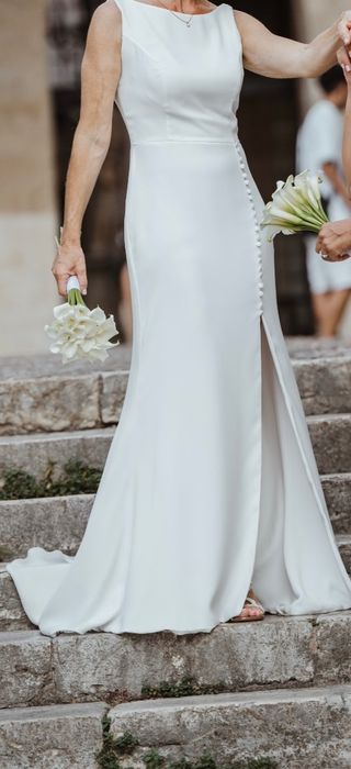 Precioso vestido de novia en color blanco como nuevo, colección 2023, ideal para una boda civil o una ceremonia íntima. Es de corte sirena, con un elegante escote barco y una abertura lateral. Luce impecable. - Talla: Mediana (M) - Estilo: Sirena - Escote: Barco - Abertura lateral