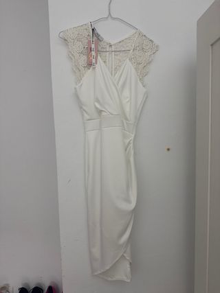 Precioso vestido blanco para boda, ideal para una celebración especial. Es de encaje floral y tiene un corte midi. - Escote en pico. - Manga corta. - Bajo con ondas. - Cintura marcada con detalle de encaje.