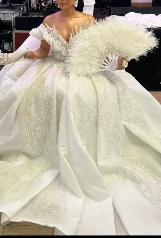 Elegante vestido de novia de corte princesa, con detalles de pedrería y perlas y pliegues estilo turco. - Diseño con escote off-the-shoulder. - Falda voluminosa con aplicaciones brillantes. - Incluye velo a juego.