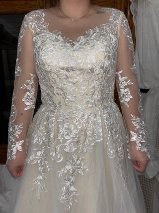 Vestido de novia sin usar, completamente nuevo. Diseño elegante con detalles de encaje. - Mangas largas de tul con apliques. - Cuerpo con escote ilusión y detalles florales. - Falda vaporosa de tul.