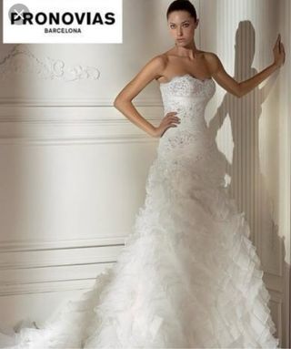 Vestido de novia de la marca Pronovias. - Diseño strapless con detalles de encaje. - Falda voluminosa con volantes. - Cinturón adornado. Nuevo costo 2000€