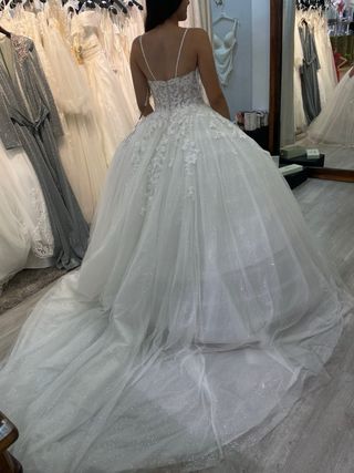 Vestido de novia deslumbrante, ideal para tu gran día. Un diseño elegante y romántico. - Tejido con brillos sutiles. - Detalles de encaje en el corpiño. - Falda voluminosa con cola.