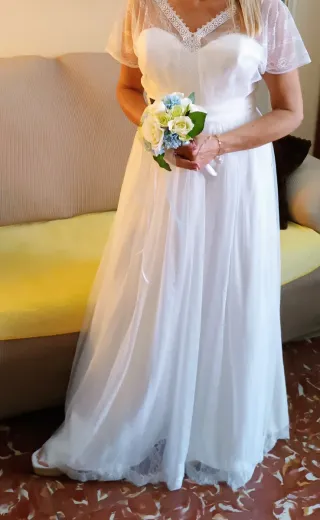 Vestido de novia de tela, ideal para una boda. - Diseño elegante. - Detalles de encaje en el corpiño. - Falda amplia y vaporosa. - Incluye velo y tocado a juego.