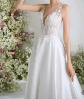 Vestido de novia adecuado para boda civil o como segundo vestido. No tiene ni una puesta ya que finalmente no lo usé. Es una talla 38, pero lo llevé a arreglar, y está ajustado a mis medidas que son: 86-75-100 y de altura 164 cm.