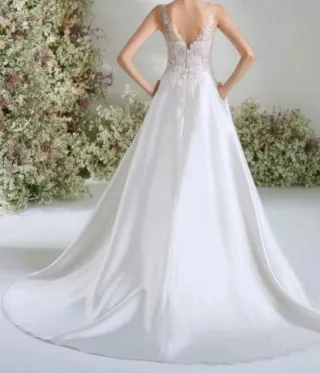 Vestido de novia de la marca, con un diseño elegante y romántico. - Cuerpo de encaje con escote en V. - Falda de satén. - Tirantes finos con detalles de pedrería.