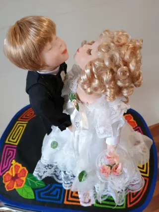 Pareja de muñecos de novios estilo vintage, perfectos para coleccionistas o decoración. - Muñeca vestida de novia con velo y traje de encaje. - Muñeco con traje de chaqueta blanco y pajarita negra.