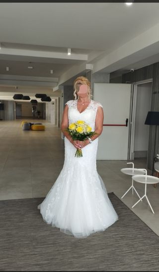 Vestido de novia Divina Sposa corte sirena, talla 38/40, mi altura es de 1,70 cm. El vestido tiene 4 capas de tela, la interior y mas gruesa es blanca lisa, siguiente un tul blanco, otro tul bordado en flores con hilos en plata, y la ultima capa con flores bordadas por todo el vestido y perlas blancas, es precioso. En la espalda y pecho las flores son bordadas en efecto tatuaje sobre la piel, se abrocha con botones en toda la espalda. Perfecto estado. El vestido y el cancán costaron 1550€, lo vendo todo por 745€. Se puede ver y probar sin compromiso