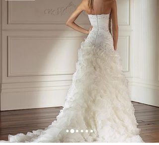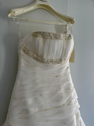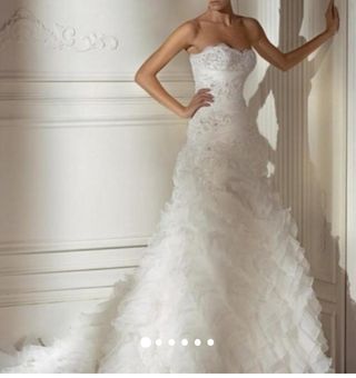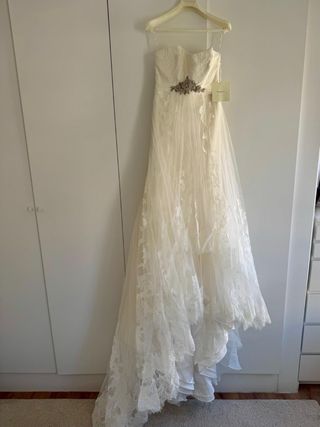 El vestido está en perfectas condiciones. La pedrería está echa a mano y también está intacta. Puesto unas horas el día de la boda. Ha pasado por tintorería. Medidas aproximadas de punta a punta: Cintura - 37 cm Cadera - 48 cm Largo desde el hombro - 160 cm (yo mido 181 cm, lo llevaba con zapatos planos) En la etiqueta pone talla 42 pero esta retocado un poco, asi que correstone a 38-40. El color es blanco-crema El un poquito elástico y eso lo hace muy cómodo. PRECIO FIJO! Comprado por 1300€