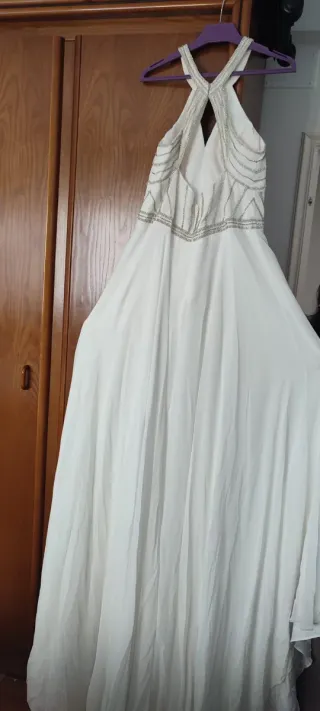 Es talla M pero vale para S tambien Precioso vestido largo, ideal para eventos especiales. ✨ El vestido es de la tienda de novias Giancarlo novias🌸 es de muy buena calidad - Escote corazón. - Diseño con detalles brillantes. - Corte ajustado que se ensancha ligeramente hacia abajo. - Perfecto para una boda o celebración.