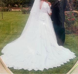 - Talla 38/40 - Vestido de novia con mangas y cancán. - Corona turca de pedreria. - pendientes a juego de la corona. - anillo a juego. - Incluye velo de 4 metros. - Abanico de plumas con broche de pedreria.