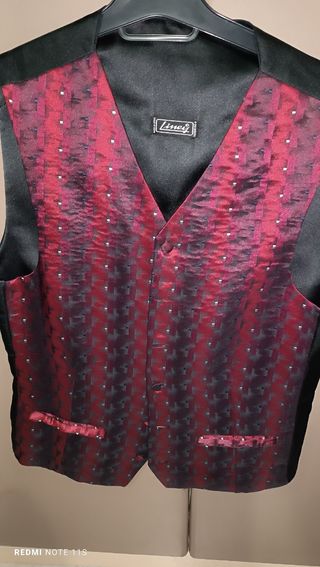 Elegante chaleco de vestir con un diseño jacquard en tonos rojos y negros. Ideal para eventos especiales. - Diseño jacquard con patrón geométrico. - Bolsillos delanteros. - Cierre de botones.