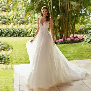 Precioso vestido de novia Pronovias de la colección Cruise 2021, modelo Holm. Talla 40-42. Estiliza mucho la figura. - Talla 40-42 - Mido 167 + 10cm de tacones - Diseño con aplicaciones de encaje floral. - Falda de tul con cola. - Comprado en 2023