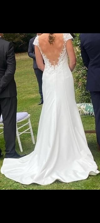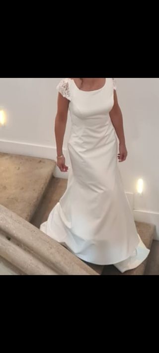 Elegante vestido de novia de corte clásico de crepe. Talla S, también podría valer para una XS - Manga francesa con botones - Escote barco - Espalda bordada de flores con botones - Corte sirena - Cola corta Solo usado una vez. Perfecto estado Lo vendo con el velo también incluido