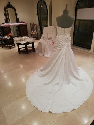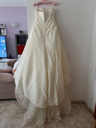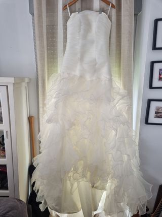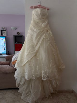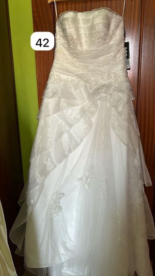 Vestido de palabra de honor, corset ajustable con cuerdas, los volantes y una pequeña cola. Talla 42/44 tiene u volante descosido, por lo demás está nuevo, solo tiene una puesta.