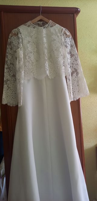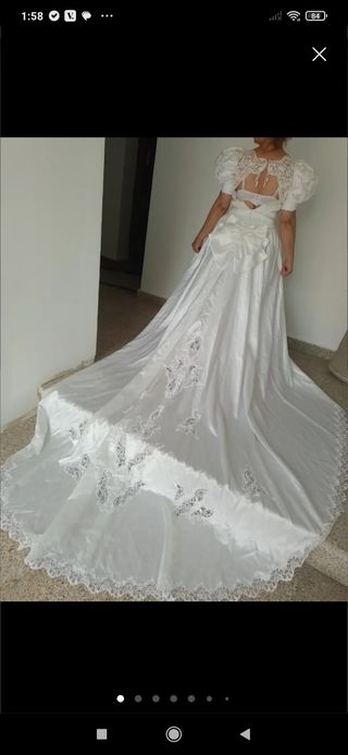 Precioso vestido de novia vintage, ideal para una boda con encanto. Es de color blanco y luce delicado. - Vestido de encaje con mangas tres cuartos. - Diseño romántico y elegante. - Perfecto para una boda civil o religiosa. VINTAGE AÑ 1982. MEDIDAS. Largo desde base de hombro a bajo 1'37 cms. Largo de sisa al bajo 1'22 cms. Ancho de Espalda 33 / 34 cms. Cintura total 63 cms. Alto de espalda 40 cms. RASO Y ENCAJE. Cremallera normal en espalda hecho a mano. Largo de manga 56 cms. remate bordado con volante y encima encaje Forrado en Raso. El encaje terminado en pico en espalda.Tiene un pequeño quemazo se ve en foto.