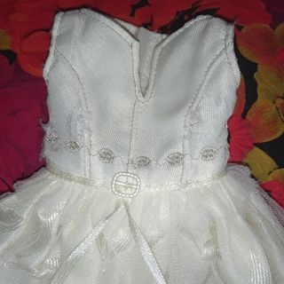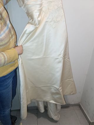 El vestido es recto y tiene una gran abertura x detrás para poder caminar. Su color es blanco roto o champagne. La cola va cosida pero se puede preparar para quitarla y aligerar el vestido a la hora de bailar. La pedrería y la puntilla se pueden transformar o quitar si no gusta. En cada capullo de la cola hay una perlita dentro, en el centro de cada uno, y debajo de la cola, para darle más volumen y cuerpo, hay un velo semirrígido que va unido a la cola. Medidas: largo desde el hombro 1'33 centímetros, cintura 43 centímetros y de axila a axila 48'5 centímetros.