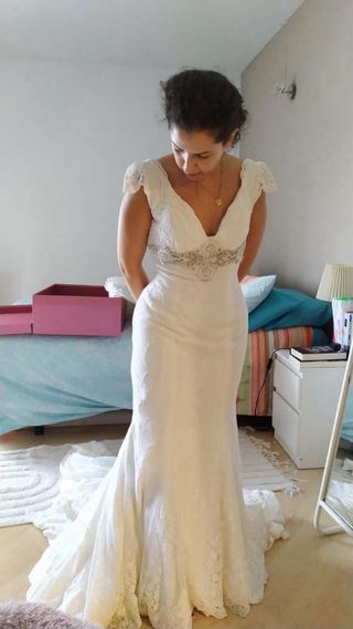 Vestido de Novia de Daniela di Marino Comprado nuevo y usado en mi boda En muy buen estado, sin ninguna mancha tal y como se aprecio en las fotos tras la lavandería Diseño sencillo con gran escote en la espalda y detalle de pedrería sin ningún defecto.Ajustado a talla S de cuerpo