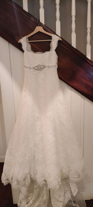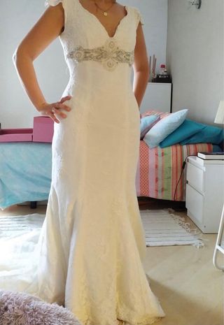 vestido de novia del diseñador Franc Sarabia. talla para una 34-36. corte sirena, de encaje de algodon y cola de mas de 1 metro. escote en pico en el pecho y en la espalda, sin mangas y con un volante de ancaje que cae en el hombro. cinturon se pedreria plateada debajo del pecho. Diseño clasico y atemporal que saca todos los años en ña nueva coleccion con pequeñas variaciones de modelo. Es precioso y sienta muy bien. Me costo 2800€ y me lo puse de 7 de la tarde a 3 de la mañana. Se entrega limpido de la tintoreria y regalo la peineta a juego. Se aceptan ofertas y puedo enviar mas fotos obresponder cualquier duda.
