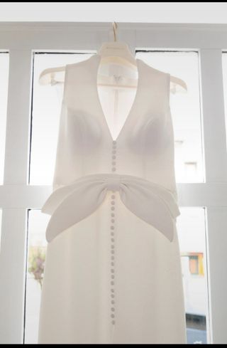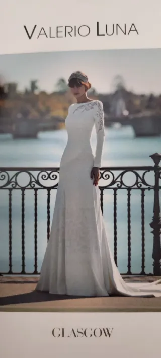 Vestido de novia de la marca Valerio Luna, sin estrenar. - Manga larga - Diseño elegante y moderno. - Tejido de alta calidad. - Con botones en las mangas y en la parte de atrás. Los botones de la cola son de vista, se cierra con cremallera. - Talla 40 - Color off white (ver etiqueta) - En su web se pueden ver más fotos y videos (precio en tienda 2400€) - La mancha de la última foto es de la tela interna, no es visible.