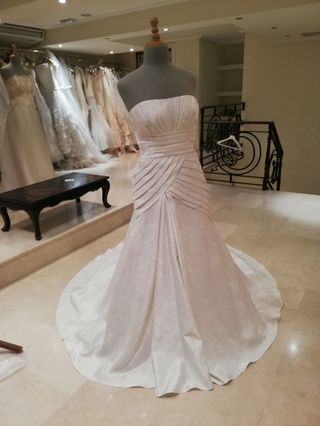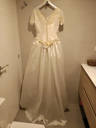 Usado una vez, está impecable,limpiado en tintorería. Tejido Mikado. Blanco roto. Se vende con el velo y el cancán.