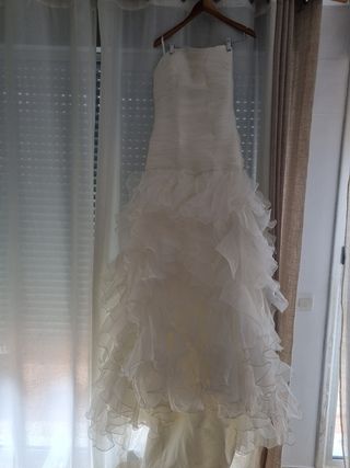 Elegante vestido de novia de Pronovias en color blanco. Diseño de corte sirena con detalles de encaje y volantes en la falda. - Escote palabra de honor. - Cuerpo de encaje. - Falda con volantes en cascada. - Cierre con cremallera oculta. Tiene para sacar ya que origunalmente era de la talla 44,luego se estrecho para una 40,42.urge venderlo de ay su precio