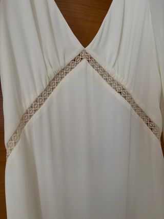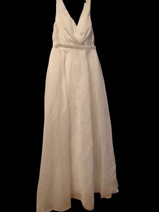 Precioso vestido de novia, ideal para una ceremonia sencilla y elegante. Es de color blanco y tiene un corte favorecedor. - Cintura marcada. - Largo hasta el suelo. - Escote en V por delante y por detrás.
