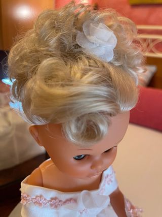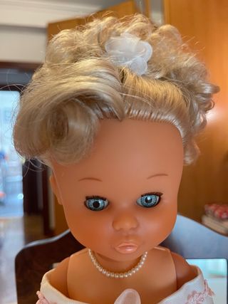 Preciosa muñeca Nancy Daypa con vestido de novia. Ideal para coleccionistas. Daypa con vestido blanco con detalles rosas. Pelo rubio ondulado, peinado original con tocado. Lleva collar de perlas, va de regalo Esta impecable, alguna duda preguntar.
