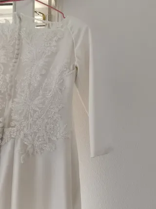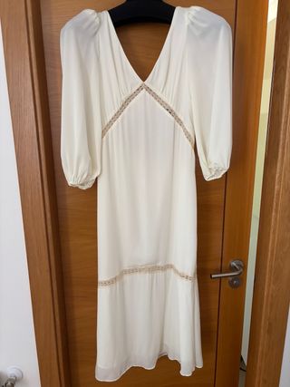 Precioso vestido de novia de la marca Lady Pipa, en color blanco roto. Es de manga tres cuartos abullonada y tiene un diseño elegante y romántico. - Cierre con cremallera invisible en el lateral. - Bajo con vuelo ligero. - Perfecto para una boda civil o una celebración especial.