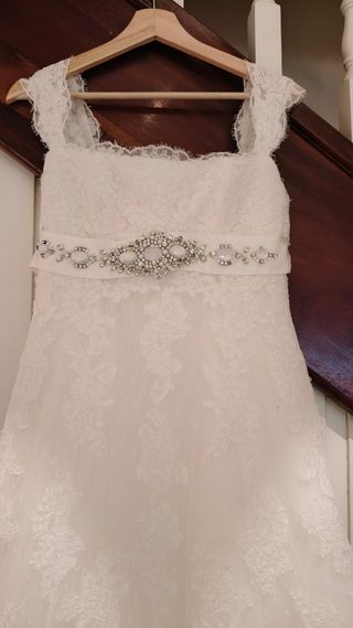 Precioso vestido de novia de encaje blanco, ideal para una boda romántica. Es un vestido de talle alto con una bonita faja con pedrería. - Diseño de encaje delicado y elegante. - Corte a la altura de la rodilla. - Una sola puesta.Limpieza en tintoreria. Marca Sant Patrick