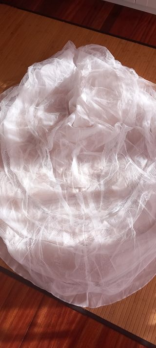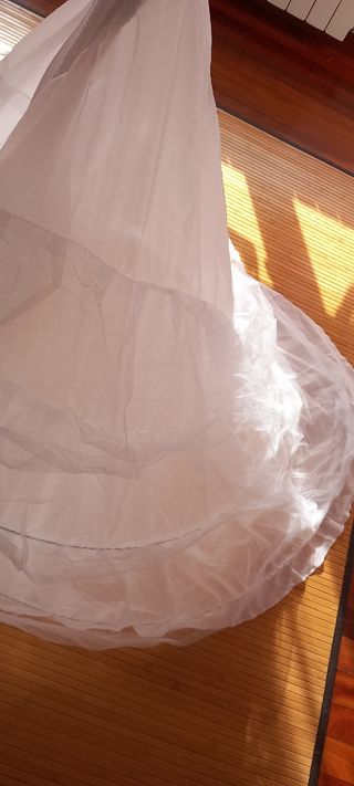 Enagua de tul blanco con cola princesa, ideal para dar volumen al vestido de novia. Trae 2 aros que se pueden extraer en función se quiera más o menos volumen. Sin usar.