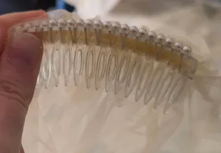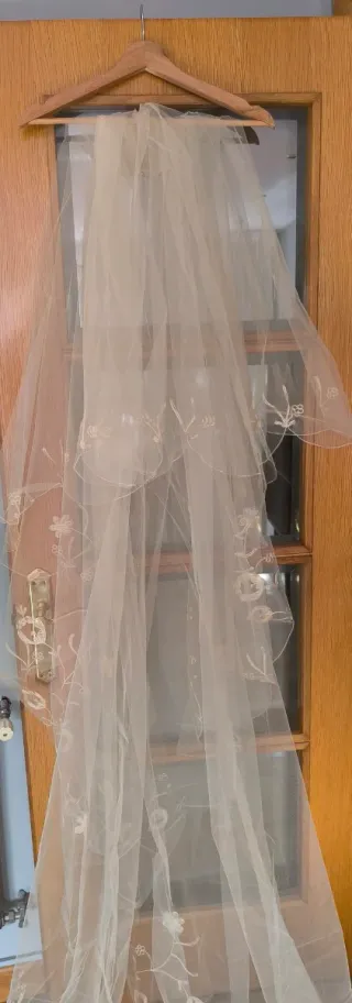Elegante velo de novia con detalles de perlas y peine incorporado para facilitar su sujeción. - Peine de plástico transparente, adornado con pequeñas perlas. - Tejido de tul fino con bordados - Utilizado únicamente para la ceremonia religiosa. - Se entrega en envoltorio original y bolsa de la tienda (Palmira novias)